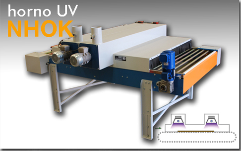Horno UV para planos NHOK-X-1300, Tunel de secado de planos barnizados con productos de curado UV. El túnel puede estar equipado con 1,2,3 l o 4 lámparas transversales de cuarzo con vapor de mercurio de 80 W/Cm y 1.380 mm de arco útil con reflector elíptico de aluminio brillante. Lámpara de Galio bajo demanda. Con sistema de refrigeración por lámpara mediante turbina. El túnel equipa viseras antirreflejo en la entrada y la salida. El túnel debe de instalarse encima de una mesa de transporte continua modelo NTBR.