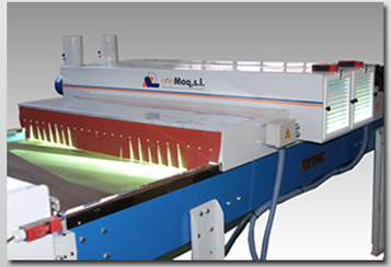 Hornos UV para superficies planas o con relieve , con lámparas de Mercurio y Galio, bien de alta o baja presión en potencias diversas, según aplicación. Estaticas , manuales y instaladas en cintas transportadoras